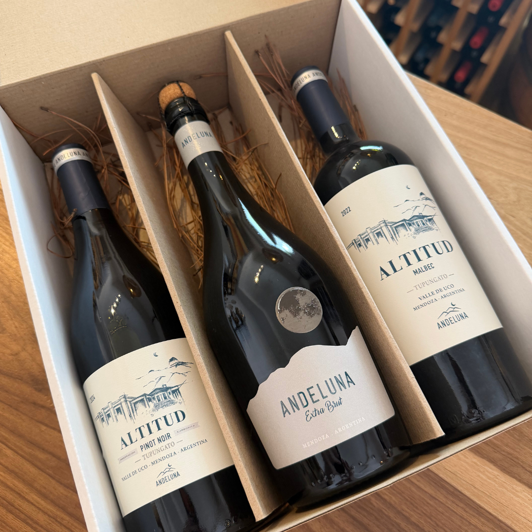 Incluye: Caja Andeluna Altitud Pinot Noir Andeluna Altitud Malbec Andeluna Espumante Extra Brut
