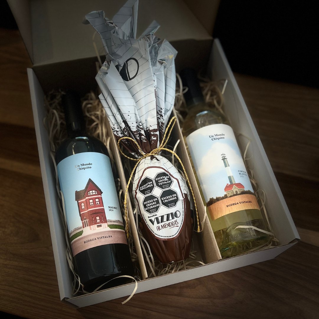Caja Bolsa Huevo Pascuas Vizzio con almendras Un Mundo Chiquito, Malbec Un Mundo Chiquito, Blend de Blanc