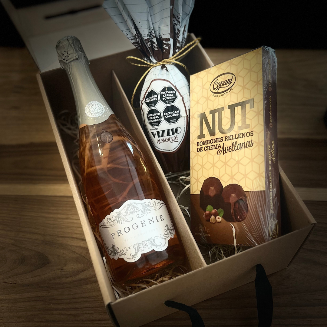 Caja Bolsa Huevo Pascuas Vizzio con almendras Chocolate Nut con avellanas Espumante Progenie, extra brut rosé